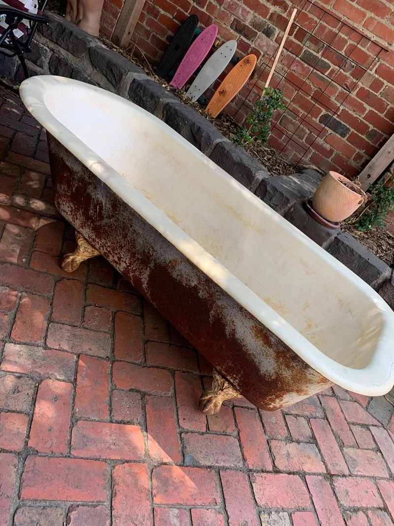 We tracked down an original clawfoot bathtub in Bendigo which had been in the same family for over 90 years! We will be using a local service provider to resurface our beautiful tub and restore its unique chrome feet. Vicky dreams of soaking in this tub in their new home. But in the mean time she has tested it out in the backyard!